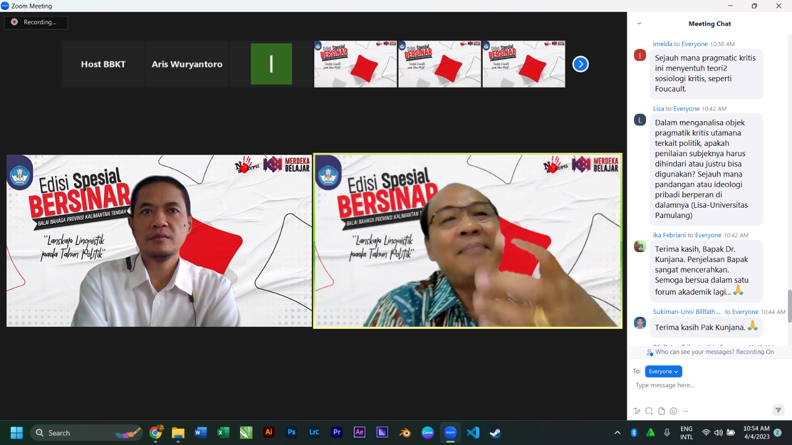 Saat membuka kegiatan, Kepala Balai, Drs. Muhammad Muis, M.Hum., menyampaikan ucapan terima kasih pada keantusiasan ratusan peserta yang mengikuti webinar tersebut. Tema Bersinar Episode 1 ini pun dirasa sangat sesuai dengan kondisi Indonesia saat ini yang sedang berada di tahun politik sehingga topik tersebut menjadi semakin menarik.
