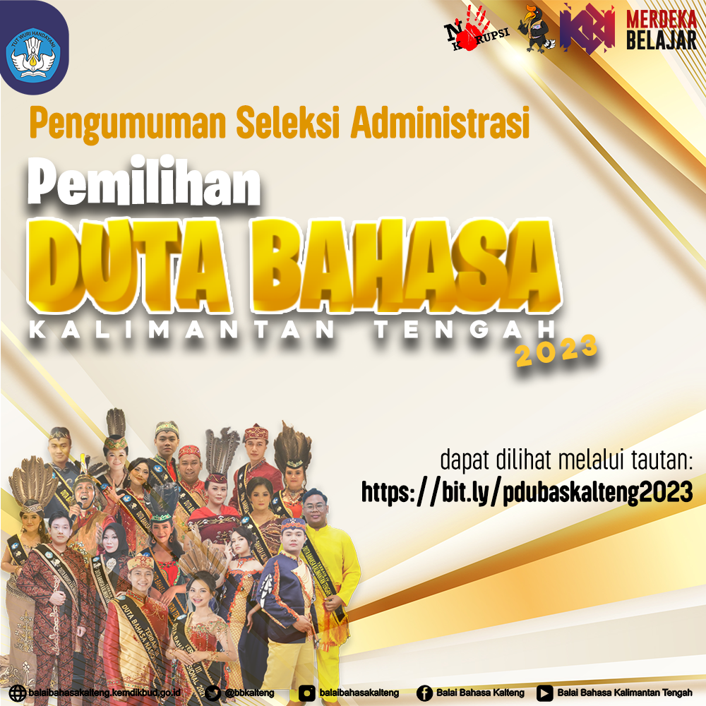 Pengumuman Seleksi Administrasi Pemilihan Duta Bahasa Provinsi Kalimantan Tengah Tahun 2023 Oleh admin12 Mei 202329 Mei 2023Berita PENGUMUMAN-SELEKSI-ADMINISTRASI-PILDUBAS-2023Download